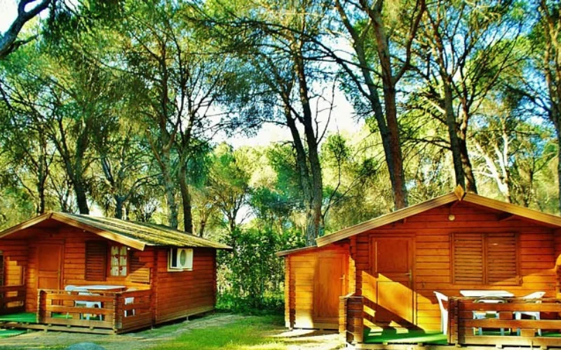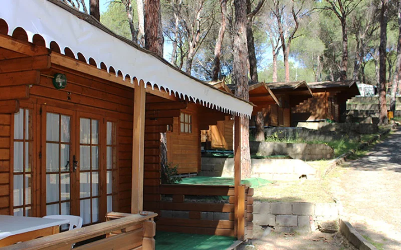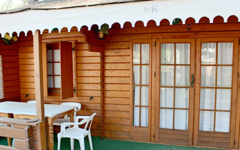 Bungalows de madera: totalmente equipados con cocina, frigorífico, menaje, baño, y porche con parcela. Disponibles para 1-2, 4 o 6 personas, ofrecen todas las comodidades para una estancia agradable y cercana a la naturaleza.