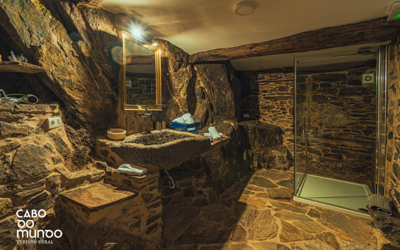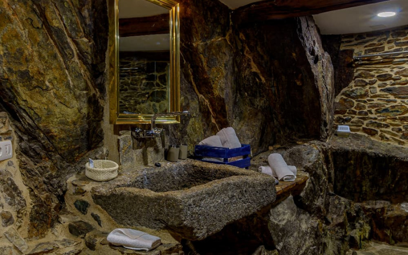 La habitación Godello, tiene el mejor baño de la vivienda, donde destaca su pila de piedra y su enorme ducha.