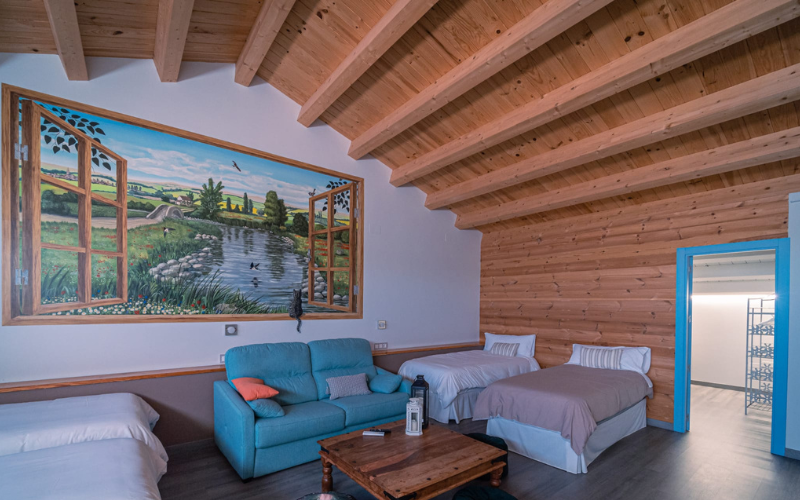 Suite Familiar Medina – Nuestra habitación más amplia, con 9 plazas (7 camas individuales, cama de matrimonio y sofá cama). Ideal para familias o escapadas en grupo.
