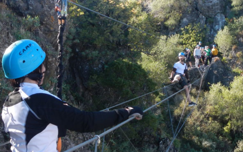 El equipo de instructores expertos —algunos con experiencia en las cumbres más altas de España— te enseñará todo lo necesario antes de iniciar la ruta. Tras una sesión de seguridad y práctica en tierra firme, te enfrentarás a un recorrido cuidadosamente preparado que incluye tanto retos en equipo (“La Escalera”) como desafíos individuales como el Puente Tibetano y el Puente del Mono, situados entre 15 y 80 metros de altura.